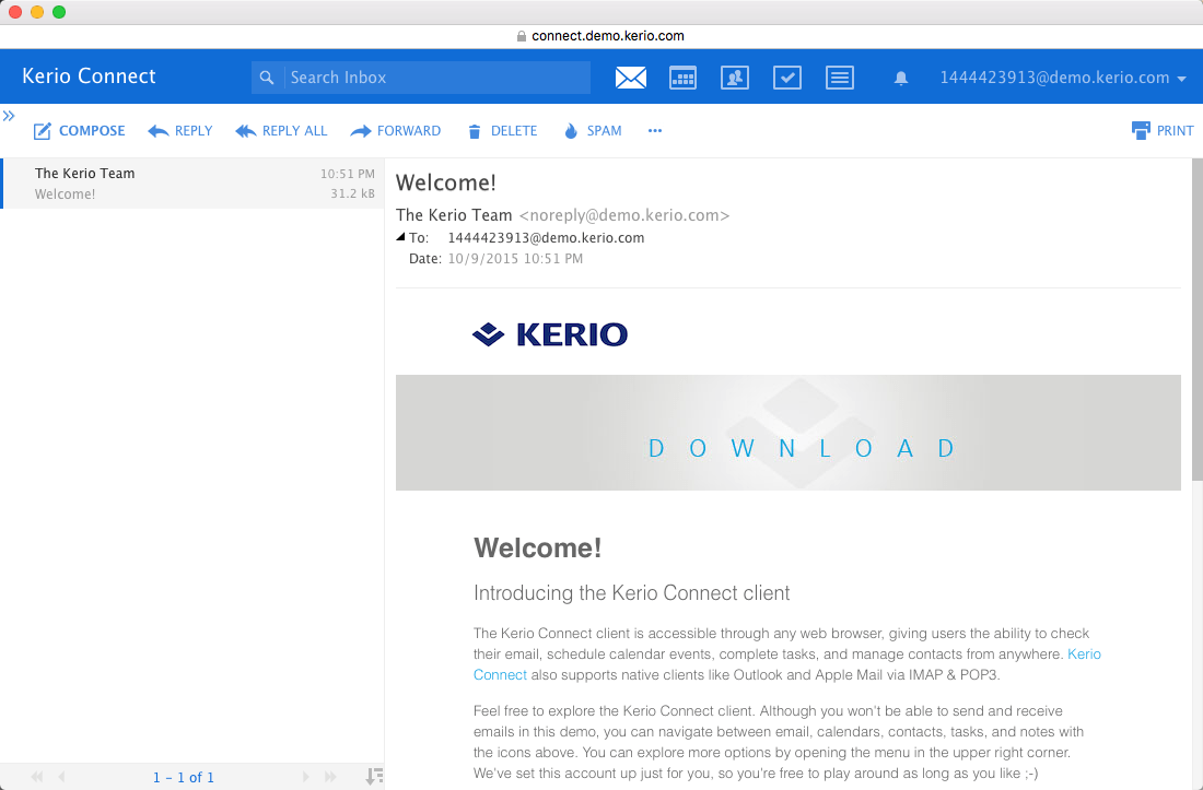 Für Nutzer, die unabhängig von einem Desktopcomputer arbeiten möchten, bietet Kerio Connect zudem einen leistungsstarken Webclient. Die intuitive und funktionale Oberfläche ermöglicht es, E-Mails, Kalender, Kontakte und Aufgaben von elke beliebigem Ort aus zu verwalten.